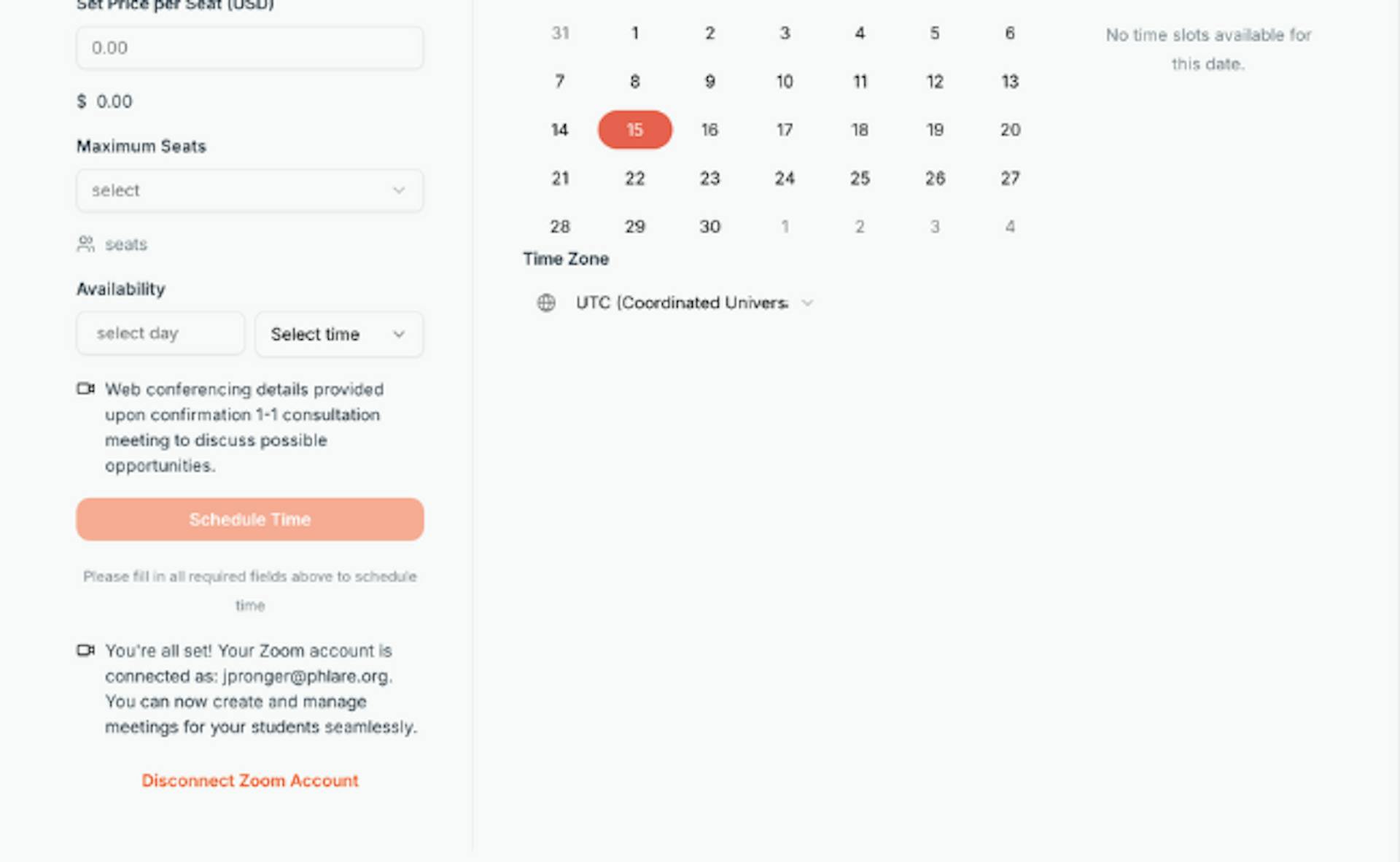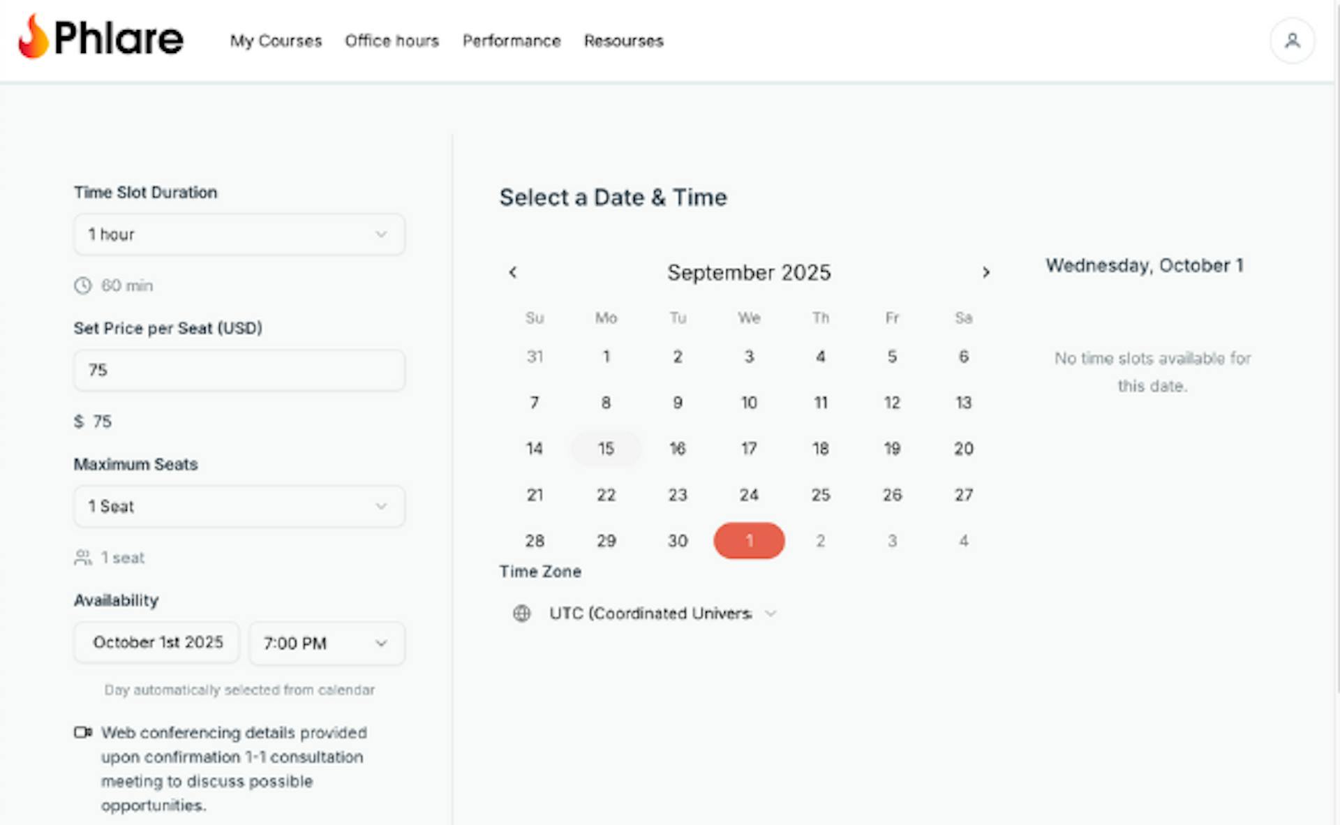 Step 3: Set the date, time, price, number of seats available and duration for your session.